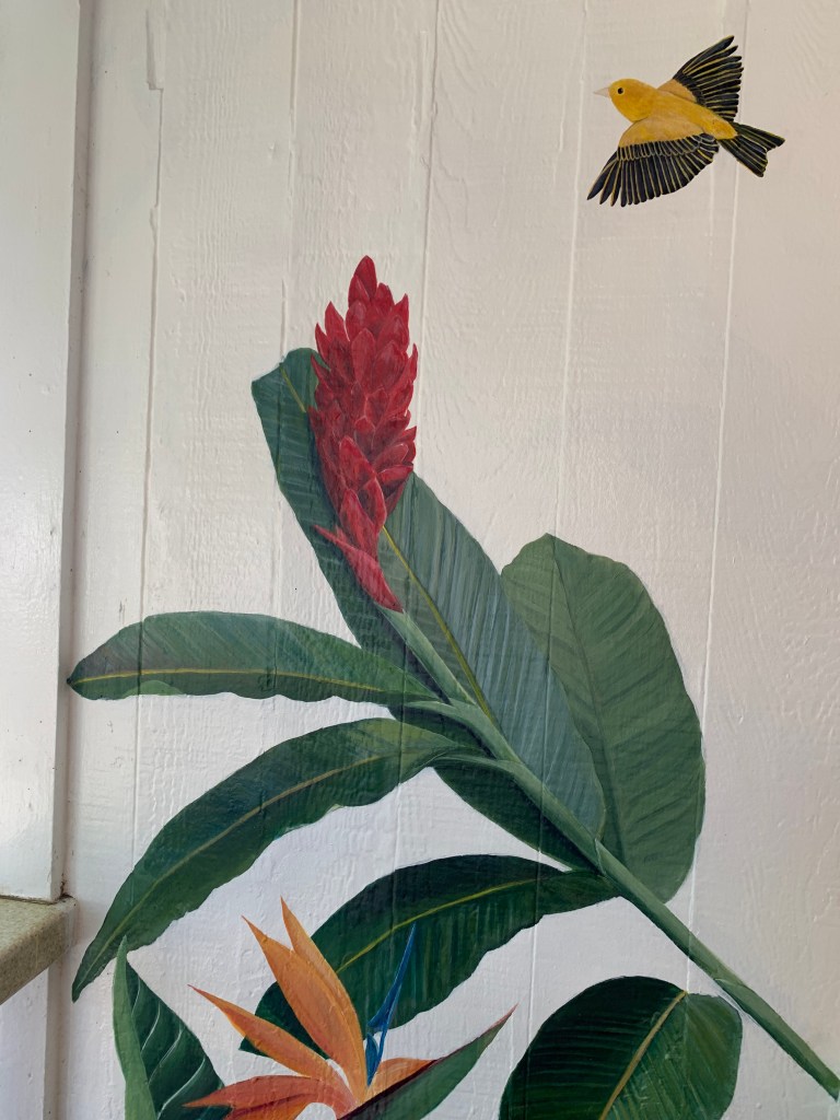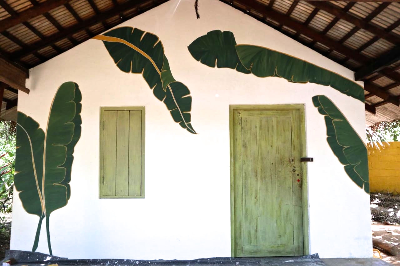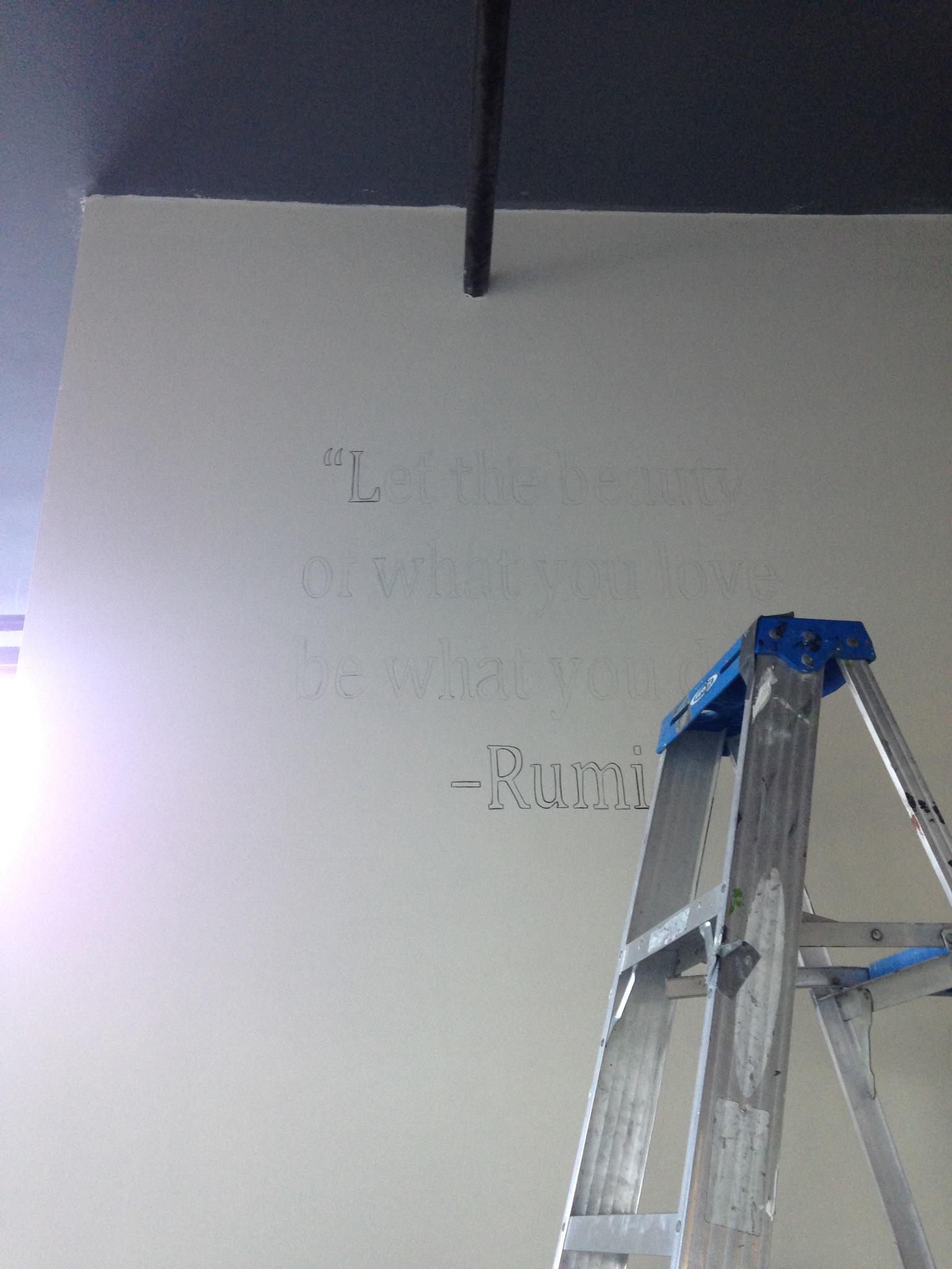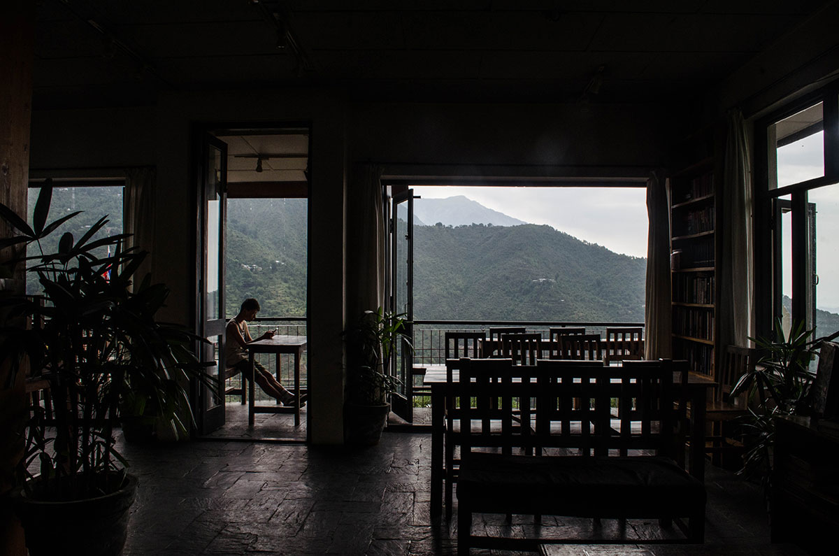 My dear friend, Jampel, writing “Tibet” underneath the thick density of the Upper Dharamsala forest mural.