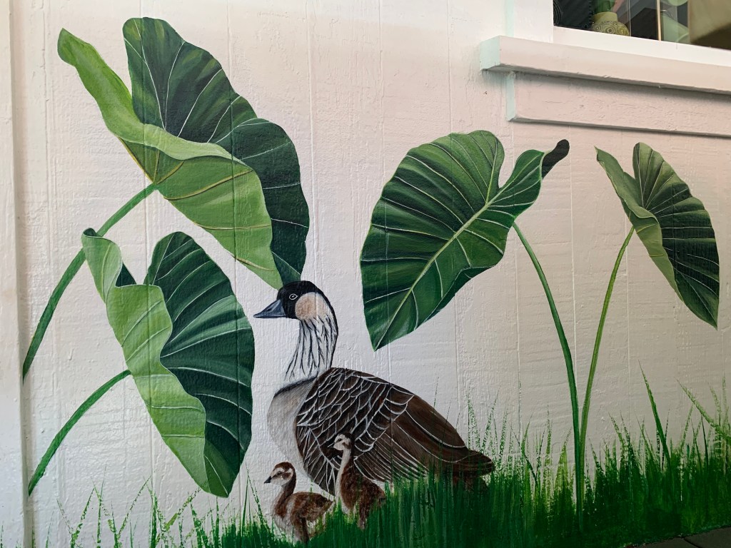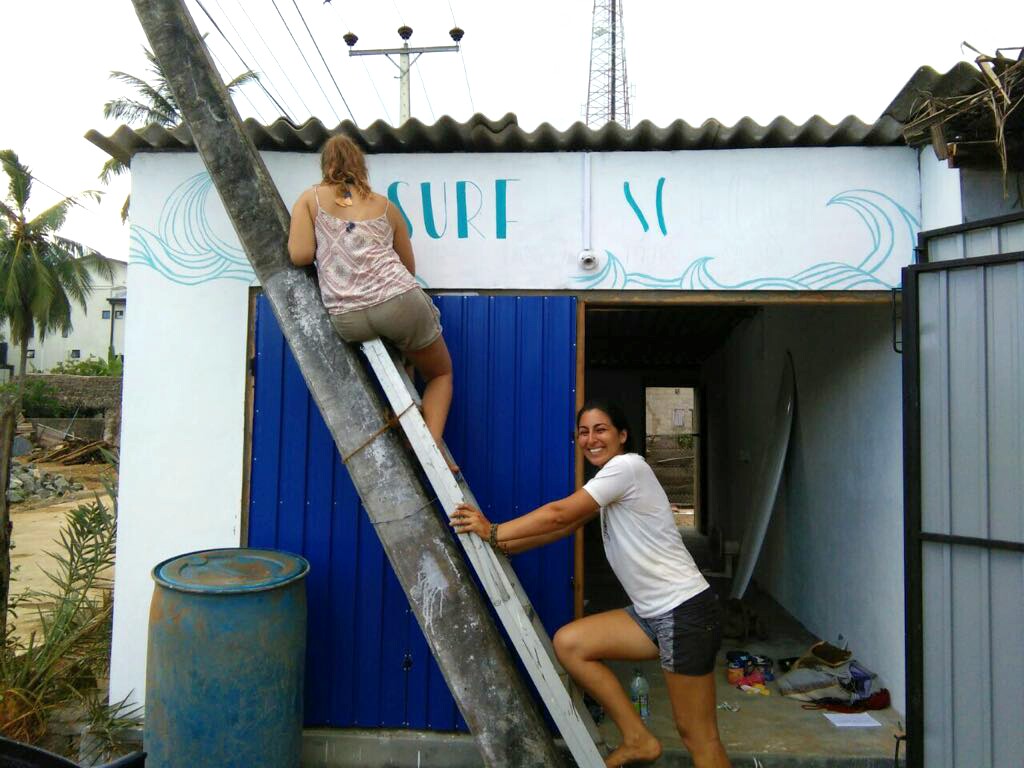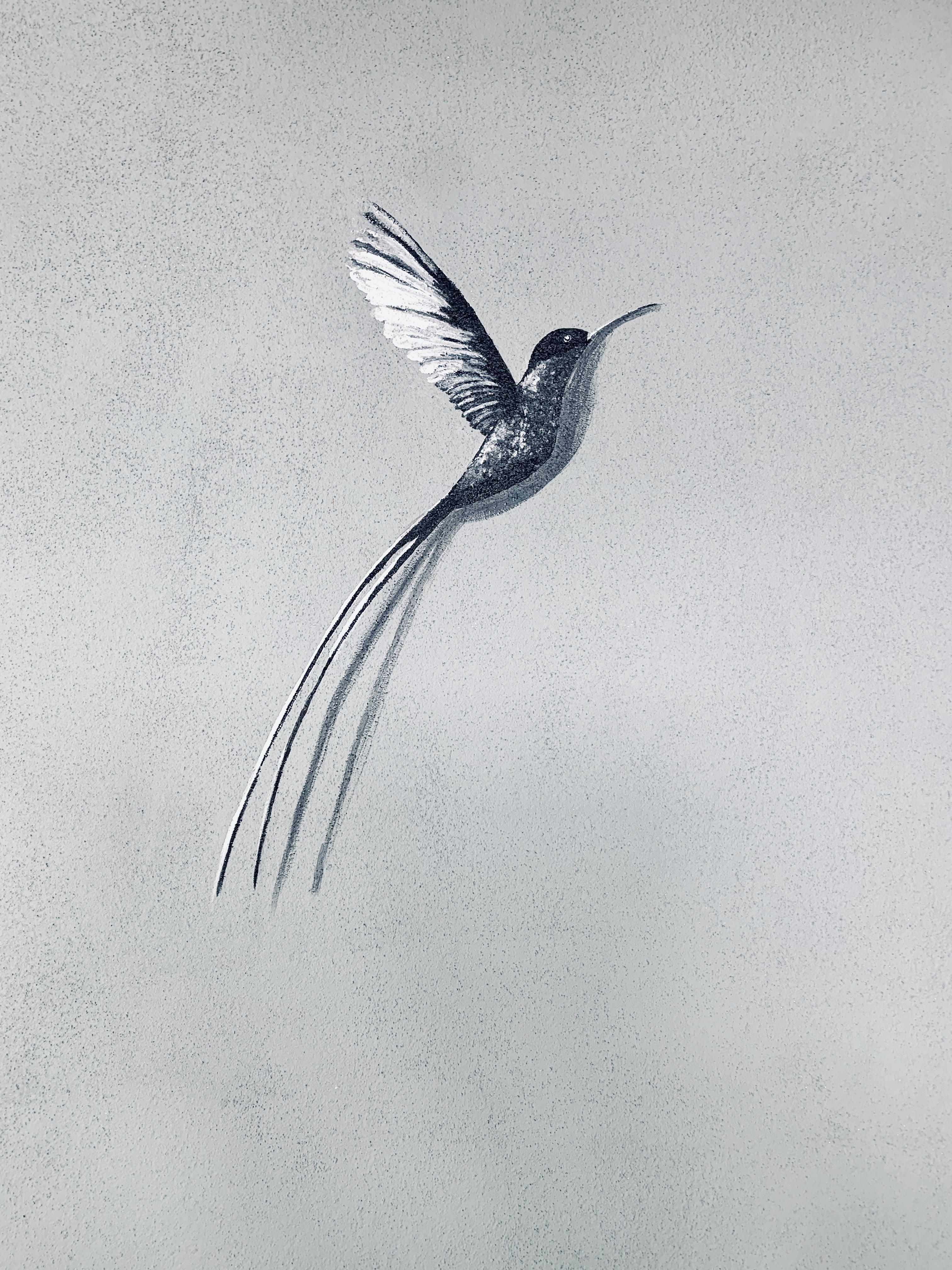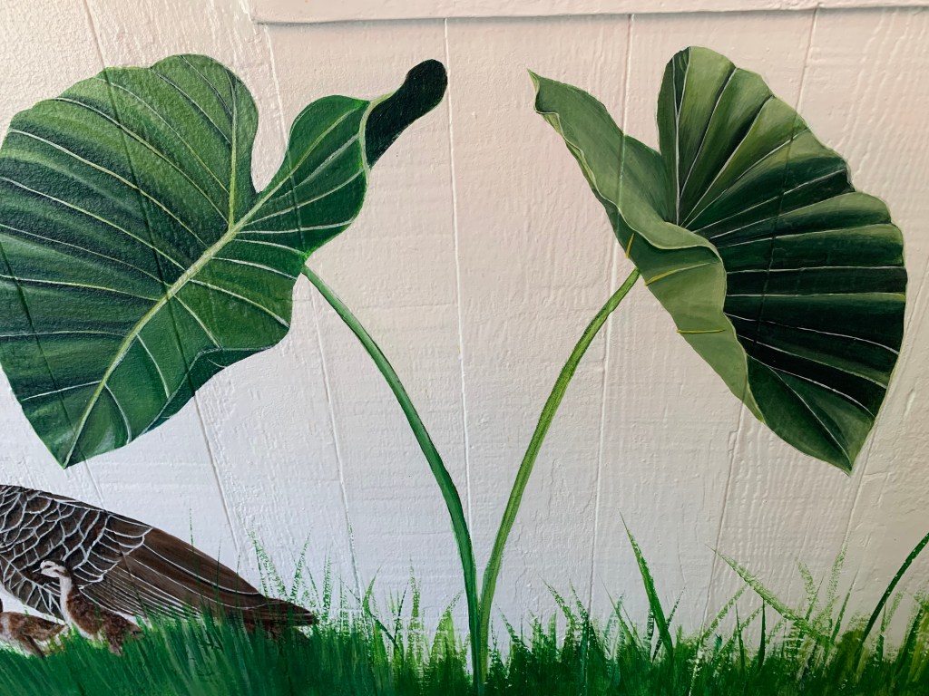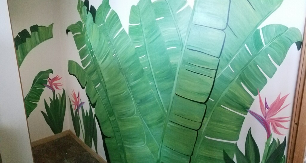 My dear friend, Jampel, writing “Tibet” underneath the thick density of the Upper Dharamsala forest mural.
